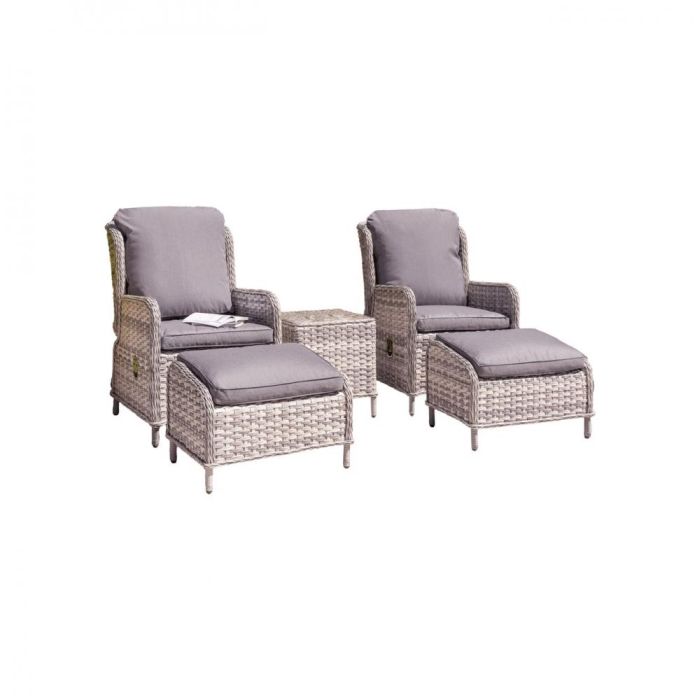 The Eden Rose Adjustable Coffee Set - 2 seater has been developed with both comfort and style foremost. The set consists of large reclining arnchairs with deep seating and soft supporting back cushions, with two matching footstools as well as a side table. The set combines a beautiful grey wide rattan weave with luxurious 'All season' cushions which are a mix of acrylic and polyester with a full inner waterproof coating. Dimensions: Reclining Chair: H100 x W65 x D78cm, Footstool: H42 x W65 x D45cm, Side Table: H50 x W45 x D45cm.