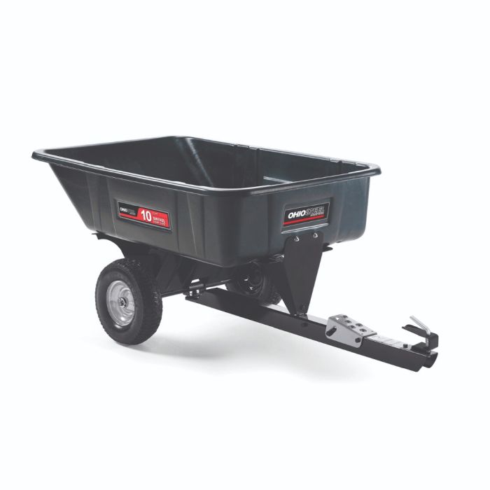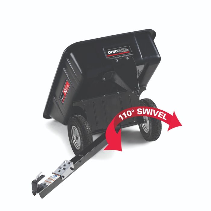 This Ohio Steel 10 cu. ft. Poly Swivel Dump Cart is ideal for medium-sized hauling jobs around your yard. The 10 cu. ft. poly body will hold up to 272kg, is easy to clean and will not rust. Upon activation of the dump release foot pedal, the bed tilts and swivels to empty the load anywhere within a 110-degree radius. Hauls mulch, dirt, rocks, firewood, and other gardening and landscaping materials with ease.