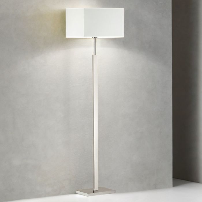This is a modern floor lamp featuring a sleek and minimalist design. The lamp has a tall, straight base finished in brushed nickel, giving it a sophisticated and contemporary look. Its clean lines are complemented by a crisp white rectangular fabric lampshade, which emits a soft, diffused light—perfect for ambient lighting in living rooms, bedrooms, or office spaces. H1570 x W290 x L400mm