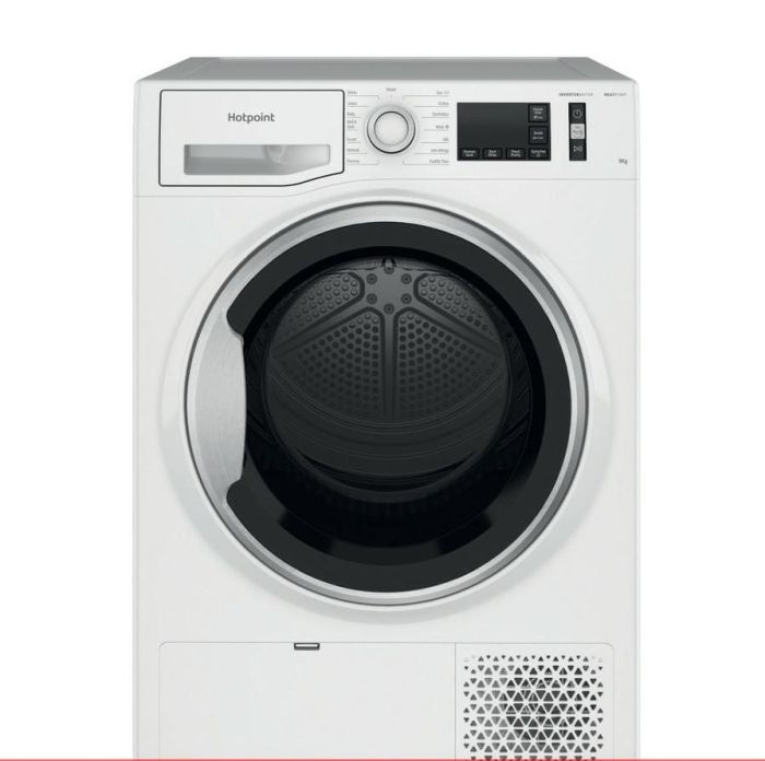 Free-standing front-load dryer, 9kg capacity, 120L drum, 258kWh/yr, 65dB. Heat pump technology dries at lower temperatures, protecting fabrics and saving energy. Features ActiveCare, EasyCleaning filter, Woolmark Blue, 16+ programmes, inverter motor, direct drain option, adjustable dryness levels, start delay, and crease care. White with black & silver door. 2-Year Warranty.