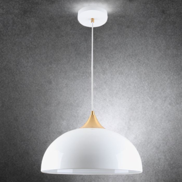 HIGH GLOSS WHITE DOME STYLE METAL PENDANT Brighten your space with contemporary elegance using this dome-shaped pendant light. Featuring a glossy white shade and a sleek brass accent at the neck, this fixture offers a clean, modern aesthetic with a warm touch of sophistication. H min280 – max1780 x D380mm Wattage 1 x E27