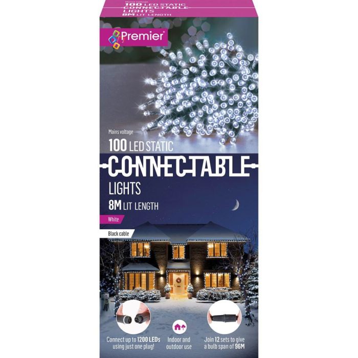 The Premier Decorations 100 LED Static Connectable Lights - White come with energy efficient LEDs and connectors which allow up to 10 sets of lights to be connected together. With a 1.5m lead cable and 8cm bulb spacing. They are suitable for use indoors and outdoors and are also available in Warm White and Multi-coloured.