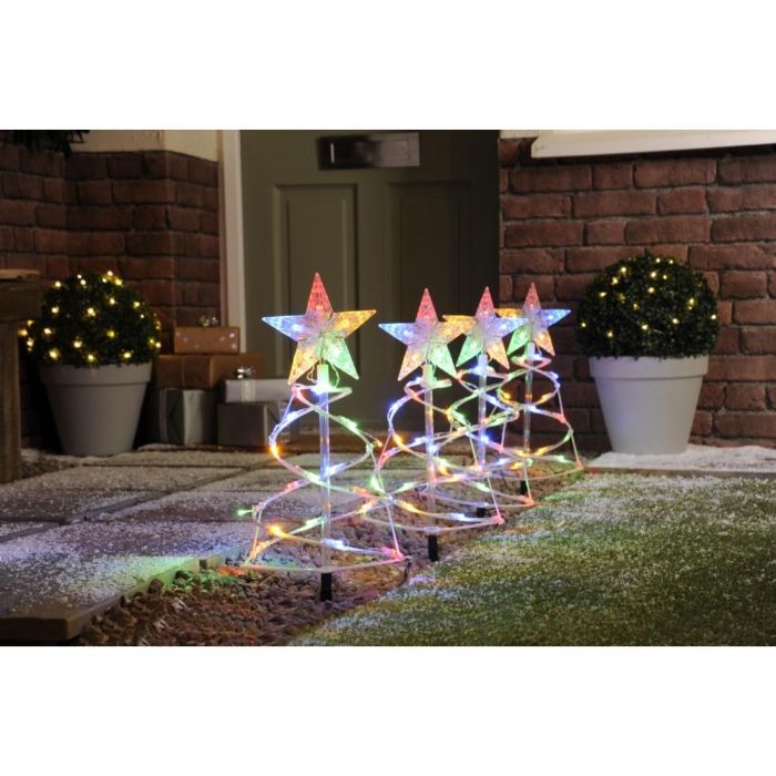 This LED Set of 4 Spiral Tree Pathfinder Stake Lights - Multi-Coloured is a fabulous functional outdoor Christmas decoration that will help friends and family find their way to your front door over the festive season. Beautifully designed, the curly lights twist up towards a star at the top, while warm LEDs illuminate a pathway or any area of your garden. All you need to make sure of is that the transformer is placed in a dry environment.