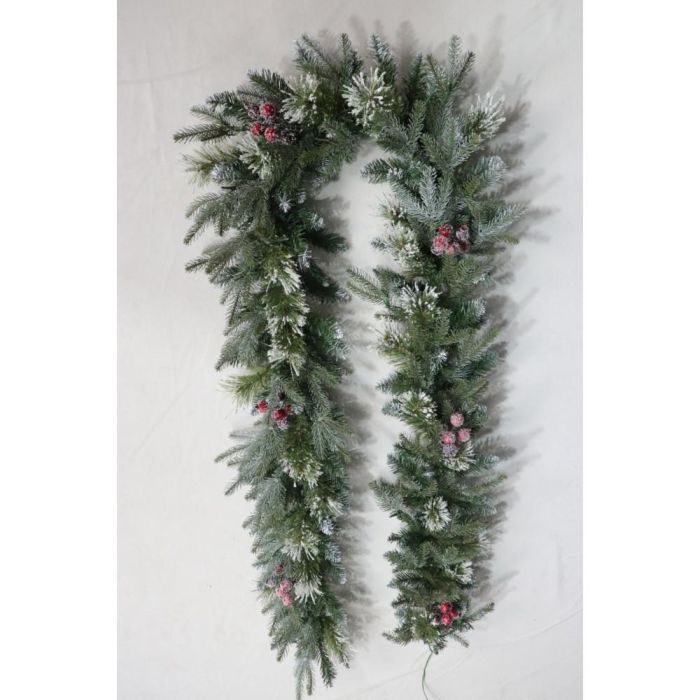 The Berry Spruce Frosted Garland - 9ft features red berries finished with frosting to create the look of freshly fallen snow. This wreath can be displayed on doors, walls, or windows for a merry look this holiday season.