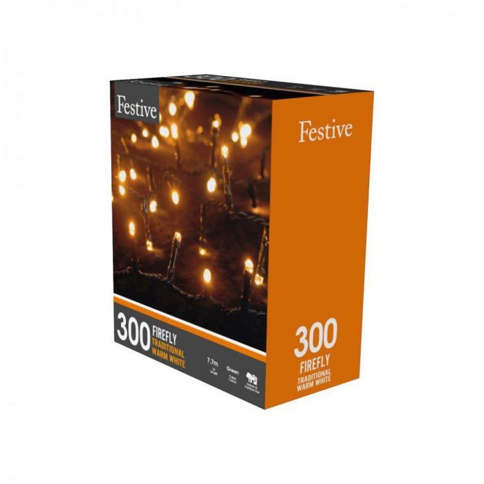 The Festive 300 Traditional Warm White Firefly Lights are perfect for lighting up your trees, wreaths and garlands. These lights feature a flickering flame effect with half of the bulbs static while the rest flicker with the bulbs tightly spaced, just 2.6cm apart.
