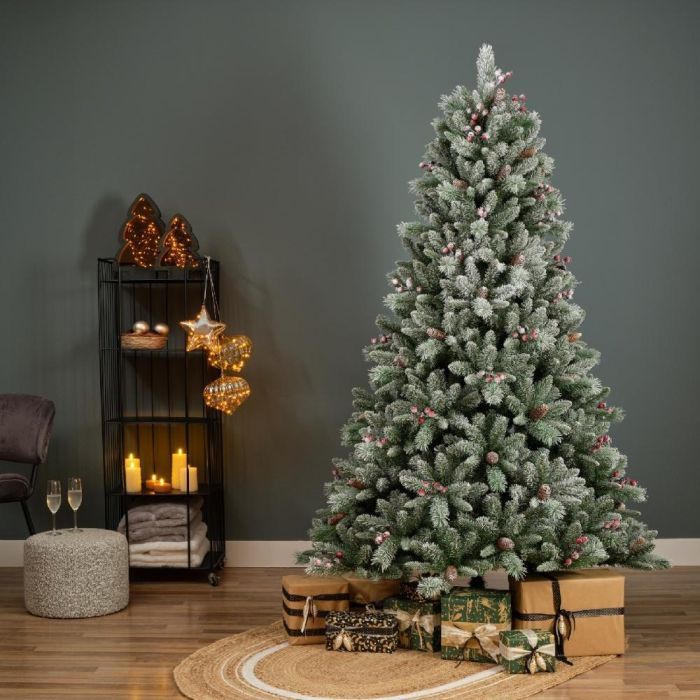 Everlands 8ft Windham Frosted Spruce Christmas Tree has a special index shape, similar to a real Christmas tree. This tree has a very natural look with its full, classically conical shape and rich green colour. This sepectacularl tree is decorated with pinecones and red berries and has a frosted finish. The hinged construction makes for quick and easy assembly. The tree comes with a metal foot stand. 8ft/240cm: 240cm x 140cm