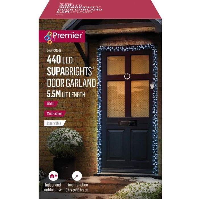 The Premier 440 LED Supabrights Door Garland 5.5M - White is perfect for decorating your door and creating a welcoming atmosphere for your guests. Timer Function (8 hours on, 16 hours off - Turn them on once and the lights will come on at the same time every day). Clear cable. Suitable for both indoor and outdoor use.