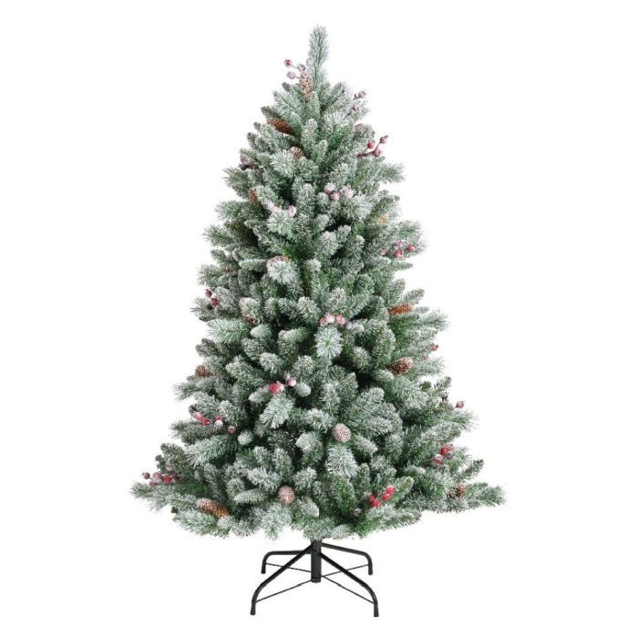 The Everlands Frosted Winhdham Spruce Tree - 5ft has a special index shape, similar to a real Christmas tree, with 648 mixed PE and PVC tree with pinecones nestled in its frosted branche. Measuring 130cm in diameter. The hinged construction makes for quick and easy assembly. The tree comes with a metal foot stand.