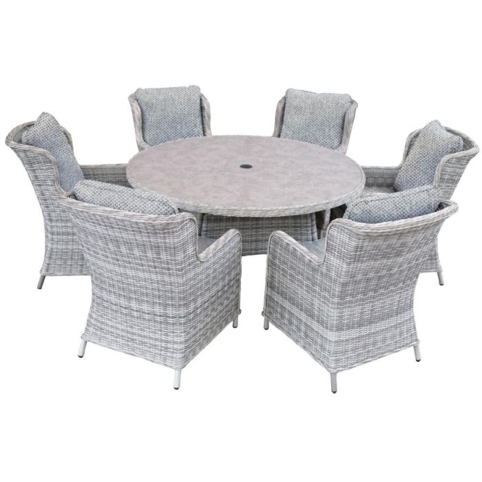 The Avignon 6 Seater Round Dining Set combines style and durability, featuring hand-woven resin weave over a lightweight yet sturdy aluminium frame. It is finished with a scratch-resistant lazy Susan for added convenience.