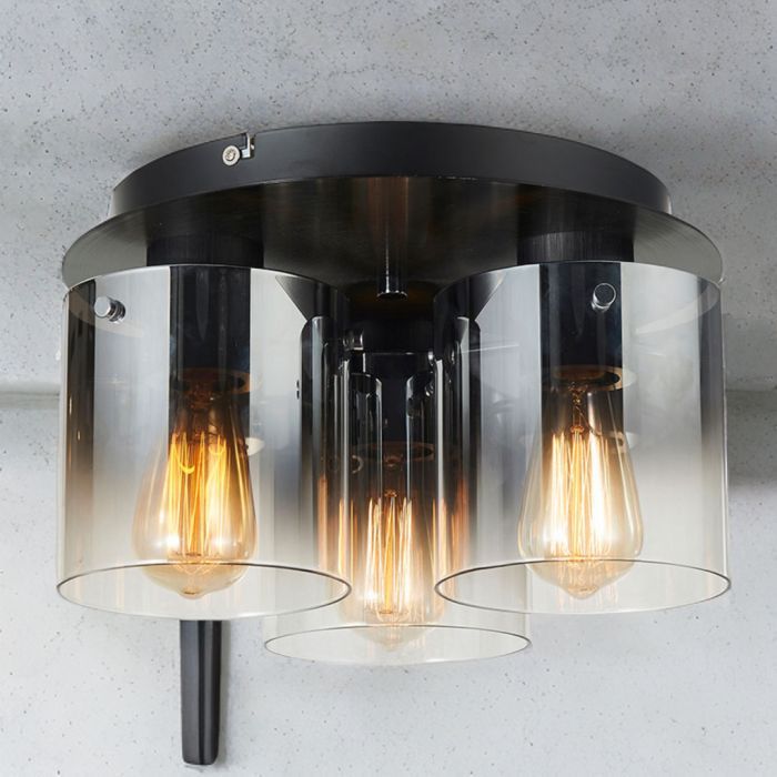 FADING BLACK VINTAGE STYLE GLASS SURFACE FITTING Bring modern elegance and industrial charm to your space with this stunning flush mount ceiling light. Designed with a sleek black metal base, this fixture features three smoked glass cylindrical shades that gracefully diffuse the light from vintage-style Edison bulbs. H210 x D370mm Wattage 3 x E27 LEDs