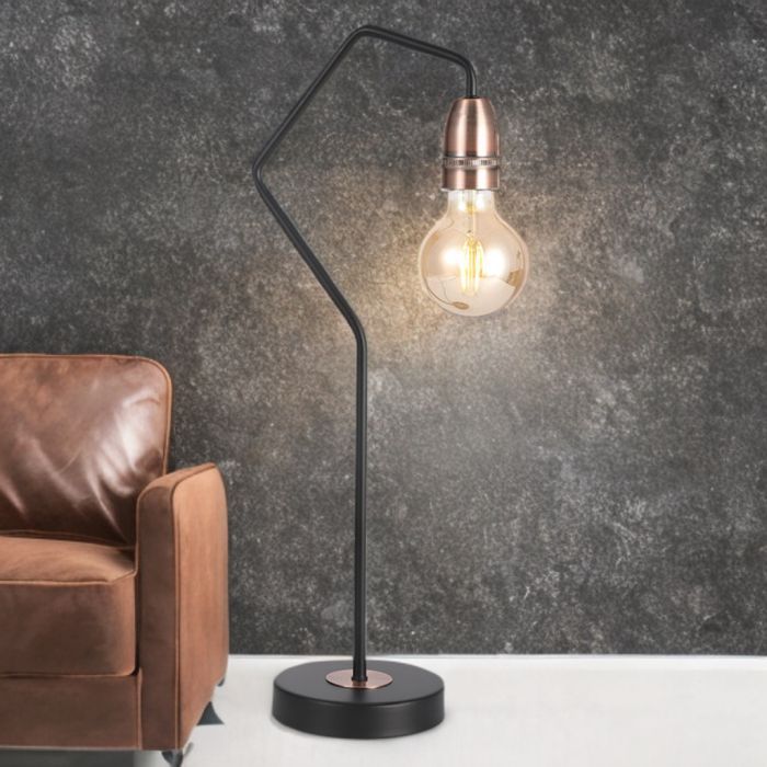 BLACK With COPPER VENUS TABLE LAMP (E27 BULB NOT INCLuded) The matte black metal frame rises from a round base in an angular, geometric shape, supporting a single exposed bulb for a minimalist aesthetic. A copper-finished socket and matching detail on the base add a warm metallic contrast, enhancing its visual appeal. H510mm X D190mm